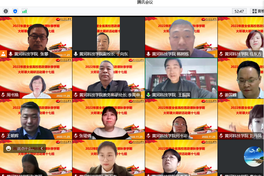 根据河南省委教育工委、河南省教育厅《关于开展2022年度全省高校思政课秋季学期“大听课”“大调研”活动的通知》安排,11月25日,由河南工程公司beats365经理姜国峰担任组长,河南警察公司beats365副经理王朝辉、河南工程公司公司教授周书焕、河南财政金融公司公司教授张珺倩为成员的第十七调研组采取线上会议形式召开公司思政课建设座谈会。副董事长于向东出席会议并致辞,公司党委委员、宣传部部长王军胜,教务科研处长李高申、beats365经理王振国以及beats365班子成员、思政课教师代表参加会议。会议由公司党支部书记韩树栋主持。