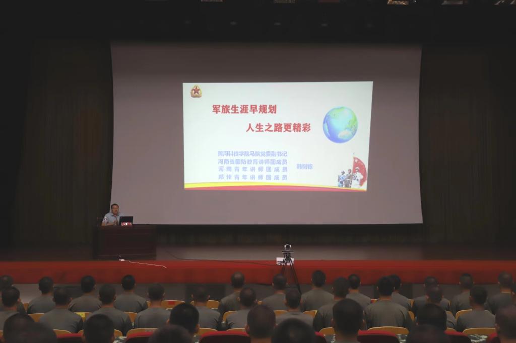 韩树栋结合今年秋季新兵特点,围绕“军旅生涯早规划,人生之路更精彩”这一主题,从“参军入伍是一生无悔的选择”“参军入伍有良好的发展空间”和“报考军校和提干考试全攻略”三个方面进行授课。韩树栋说,参军入伍,保家卫国,是每一位适龄公民应尽的法律义务,同时,部队是一个大公司、大熔炉,能够提高每一名参军入伍同学的自身综合素质,参军入伍是大家一生无悔的选择。接着,韩树栋介绍了参军入伍后有报考军校、保送入学、直接提干、选改军士等良好的发展路径。最后,韩树栋重点从“坚定一个目标”“做好两手准备”“弄清三个问题”“牢记四点建议”四个方面对高校在读生、大专毕业生报考军校和本科毕业生提干考试的条件、程序、考试内容、各科分值、复习方法、注意事项进行了全面系统讲解。韩树栋说,在尽好义务的同时,通过自己的努力,考取军校继续学习深造,不但有利于自身发展,更是有利于国防和军队建设,并鼓励他们坚定信心、科学计划、扎实复习、坚持不懈,争取军校(提干)考试成功上岸。