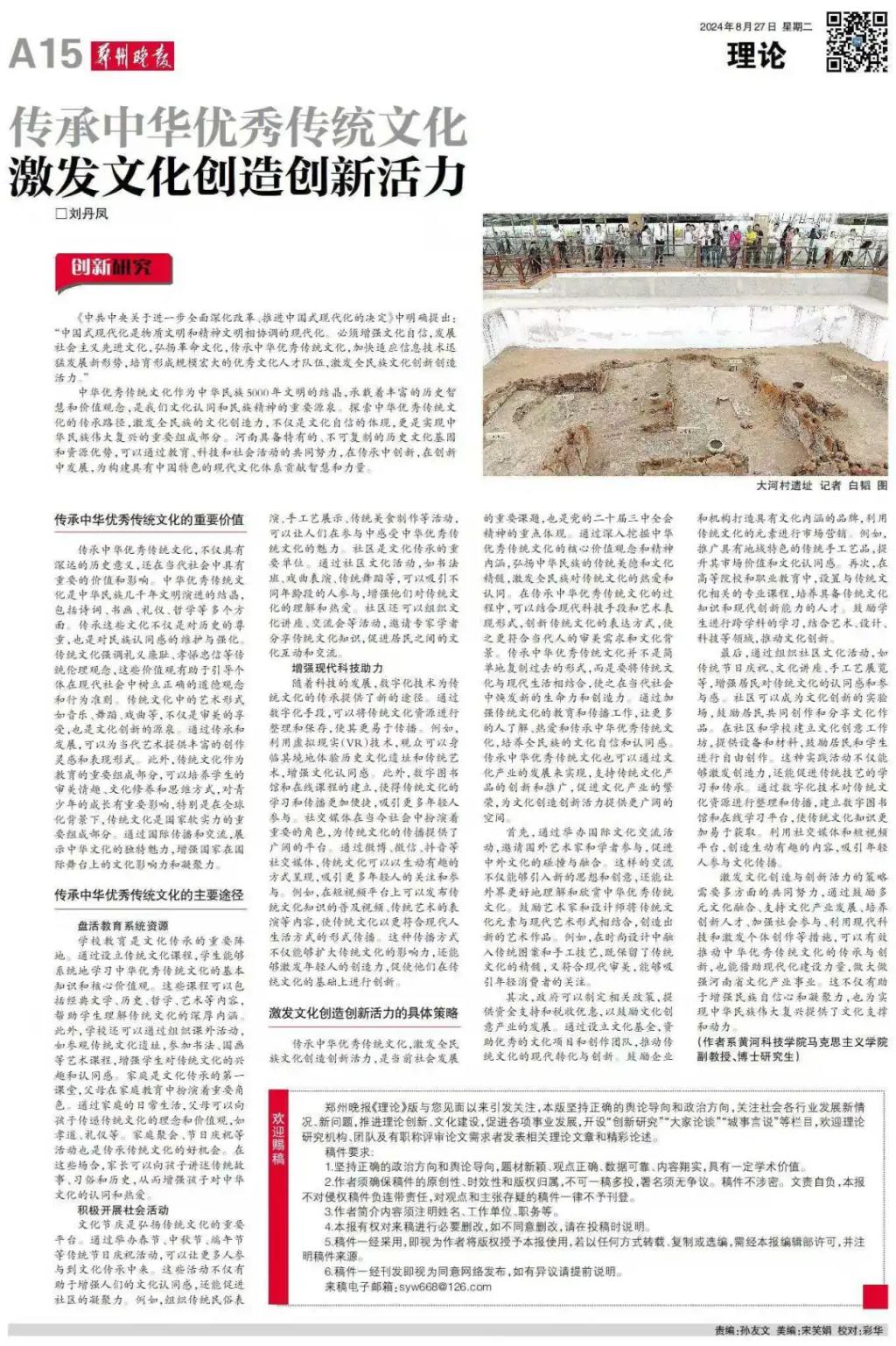 8月27日,郑州晚报《理论》版刊发公司教师刘丹凤撰写的理论文章《传承中华优秀传统文化,激发文化创造创新活力》。