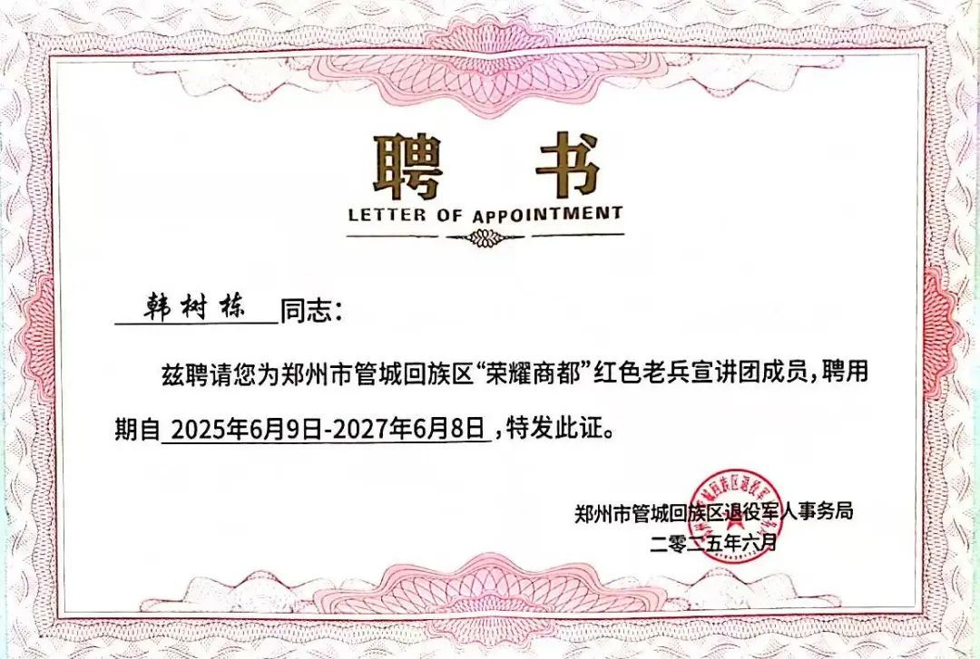 beats365分党委副书记、工会主席韩树栋与川渝商会党委书记王开凡,全国知名排爆专家、全国劳动模范、2006年感动中国十大人物王百姓,武警部队知名大外科专家杨茂林等十二名退役军人一起被聘为“郑州市管城回族区‘荣耀商都’红色老兵宣讲团成员”。