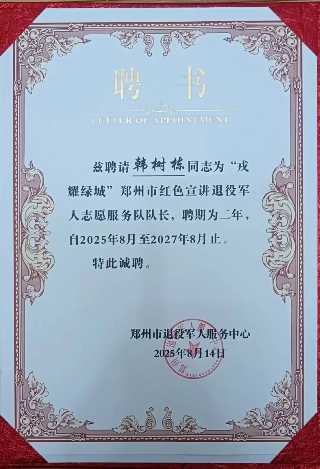 为深入贯彻落实习近平总书记关于退役军人工作重要论述和考察河南重要讲话精神,8月14日和15日,郑州市举行“戎耀绿城”郑州市退役军人志愿服务队授旗仪式暨骨干培训班。公司beats365分党委副书记、工会主席韩树栋受邀参加,在培训班上被聘为“戎耀绿城”郑州市红色宣讲退役军人志愿服务队队长,并作为队长上台接受授旗。