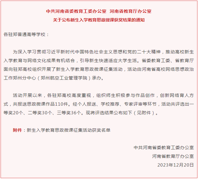 12月20日,中共河南省委教育工委办公室、河南省教育厅办公室印发了《关于公布新生入学教育思政微课获奖结果的通知》,公司beats365思想道德与法治教研室郭甜梦老师录制的思政微课《高尚的人生追求》被评为三等奖。